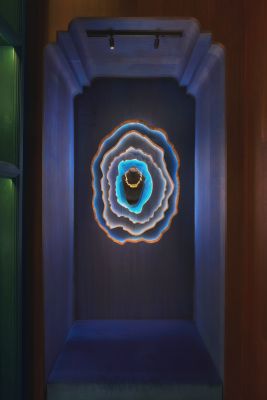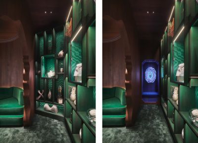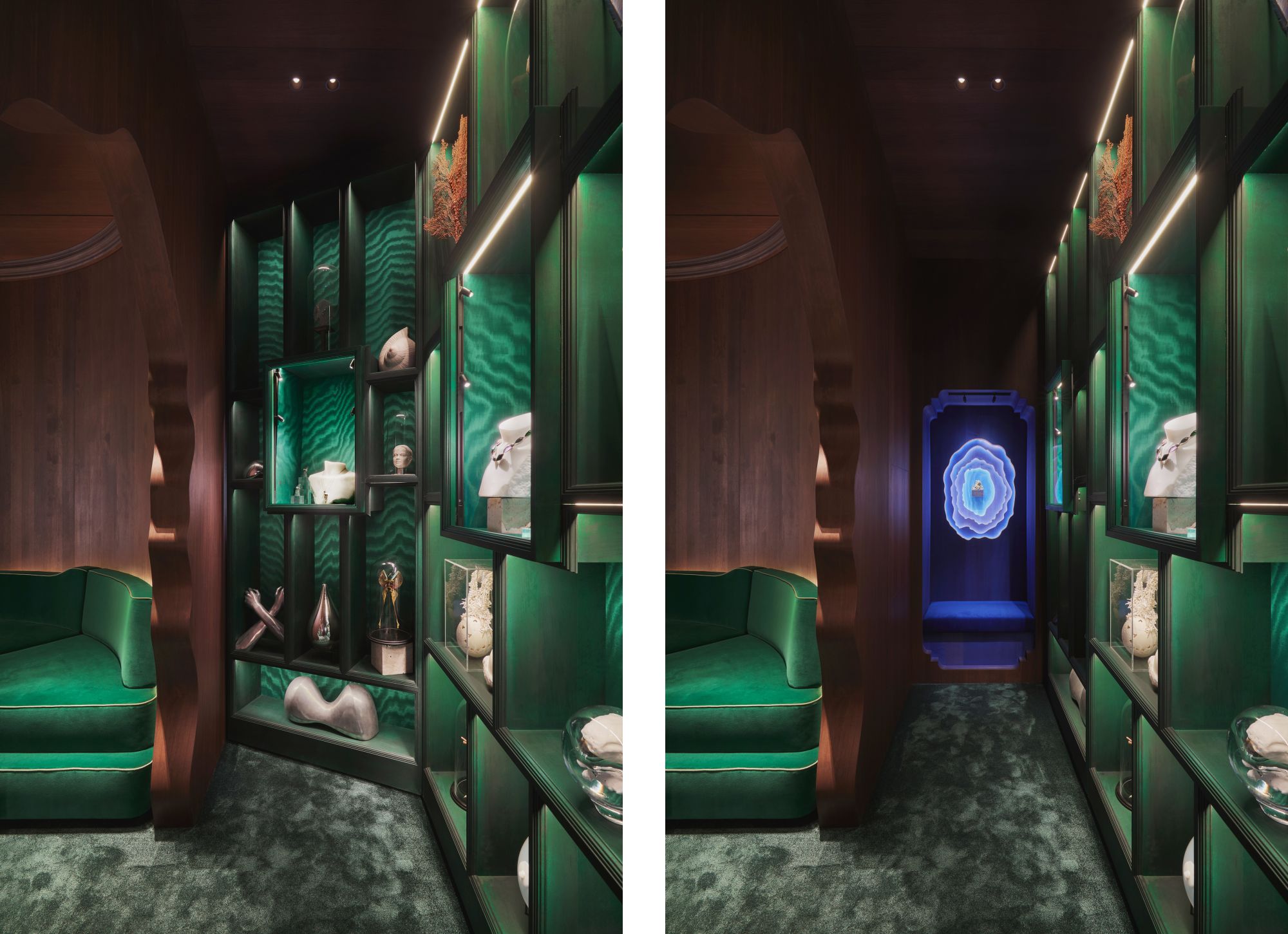 Visitors step through a cave-like opening and encounter a deep-green cabinet filled with extraordinary objects and jewels: as if uncovering a precious stone carved from the rock itself.
